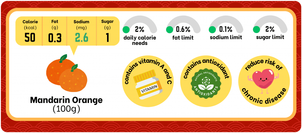 As the most “handy” snack, mandarin oranges are called ‘Kam’ in Hokkien, meaning gold, symbolizing wealth and prosperity. They’re low in calories at just 50 each, packed with vitamins A and C. Additionally, their antioxidants help neutralize free radicals and reduce the risk of chronic diseases such as heart disease, diabetes, and cancer.