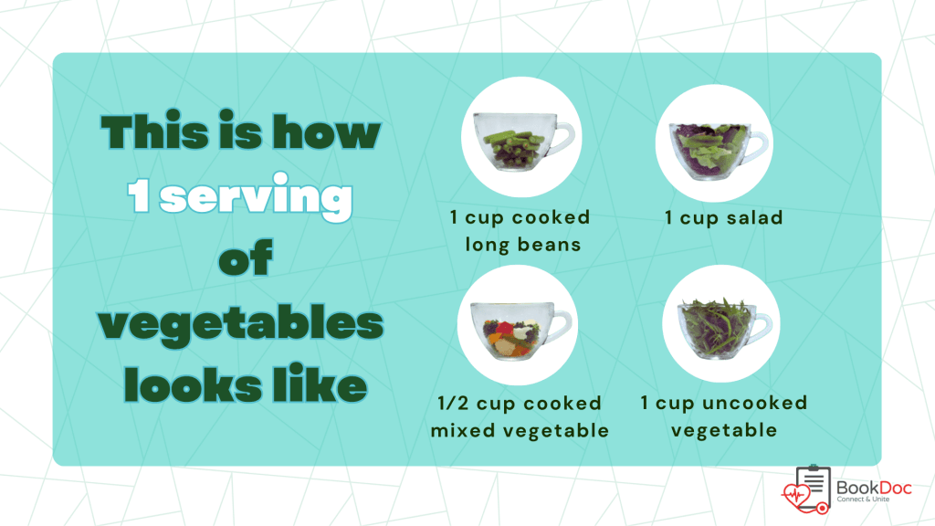 Begin by filling your plate with a serving of fiber-rich vegetables for example leafy greens, cucumber, or tomato as in illustration below. Then fill the rest of your plate with a mix of lean protein, whole grains, and healthy fats, following the Suku-Suku Separuh concept. Don’t forget your fruits. They can be enjoyed with your meal or as a healthy snack in between.This combination helps slow the release of sugar into your bloodstream (2) and keeps you full longer rather than experiencing the quick energy crash that often comes from an unbalanced meal.