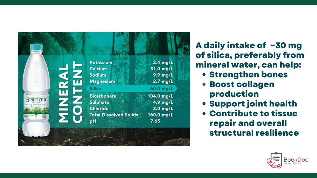 Silica, also known as dietary silicon, is naturally present in mineral water. Research suggests that silicon supports better bone health by stimulating collagen synthesis and enhancing bone mineral density (4). It also contributes to improved skin structure and elasticity by promoting collagen formation and maintaining connective tissue integrity (5). Importantly, mineral water provides a natural and easily accessible source of silica, making it one of the simplest ways for us to support our bones and skin.