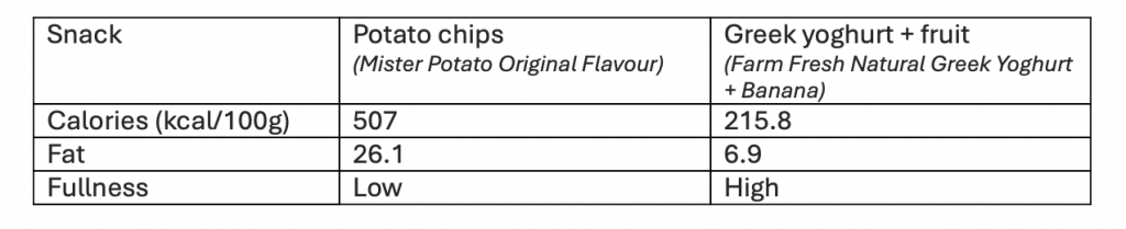 Chips are high in fat and salt but low in nutrients — what we call “empty calories”. Greek yoghurt with fruit gives you protein, fibre, and lasting energy.