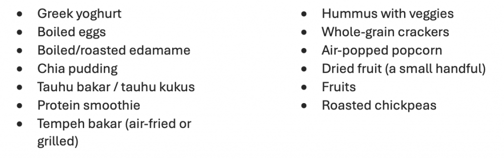 Need a grab-and-go snack? Nuts, boiled eggs, or roasted chickpeas work great.