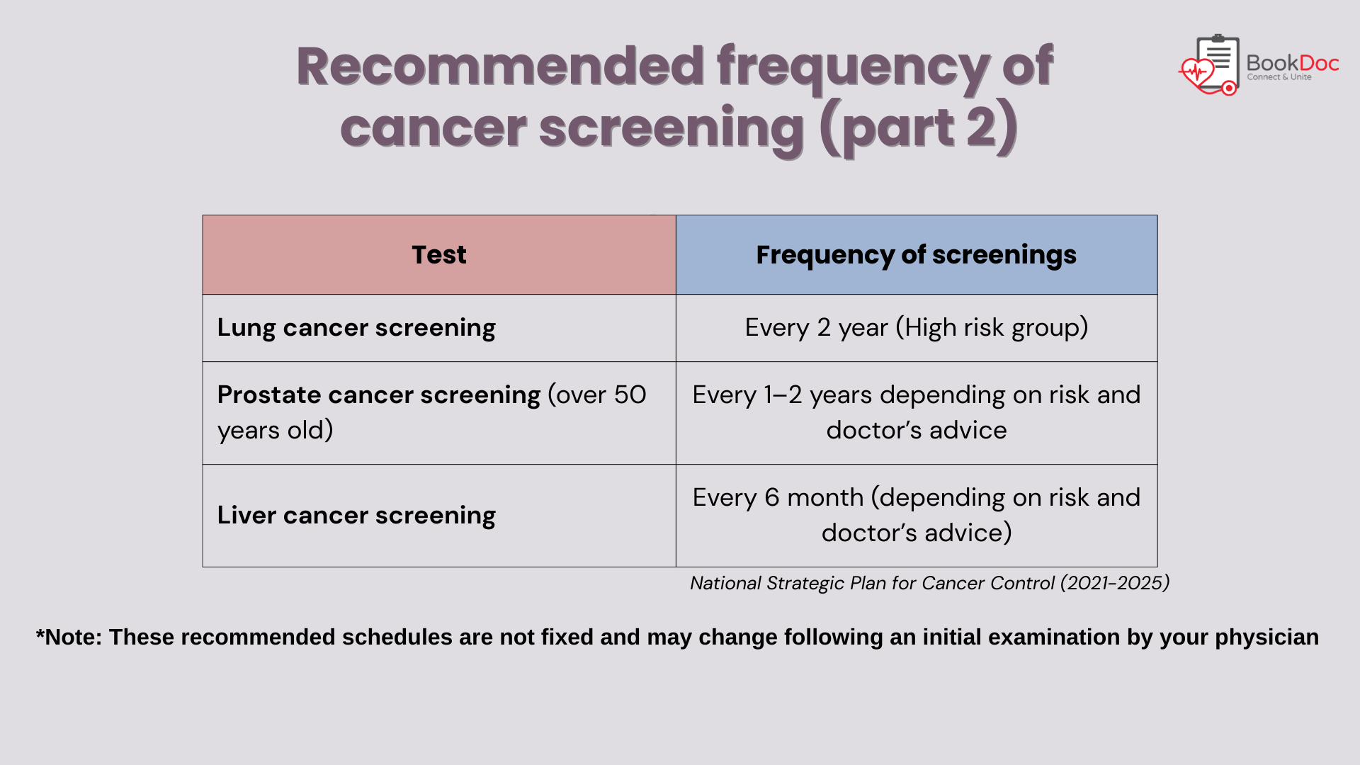 Screening recommendations differ by age, family history, and lifestyle, so it is always best to consult a healthcare professional.